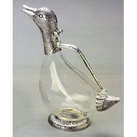 Carafe à décanter le vin forme canard. Cette carafe à décanter le vin est en verre soufflé bouche et métal argenté.