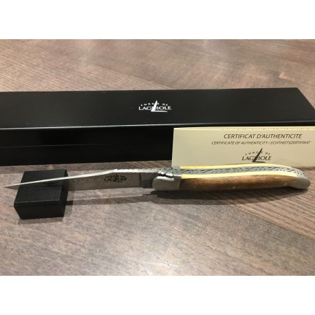 Manche en noyer placage buis, associé à une lame en damas inox rose 144 couches.