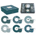 Coffret de 6 tasses à café avec anse en porcelaine décoré, soucoupe ronde également en porcelaine.